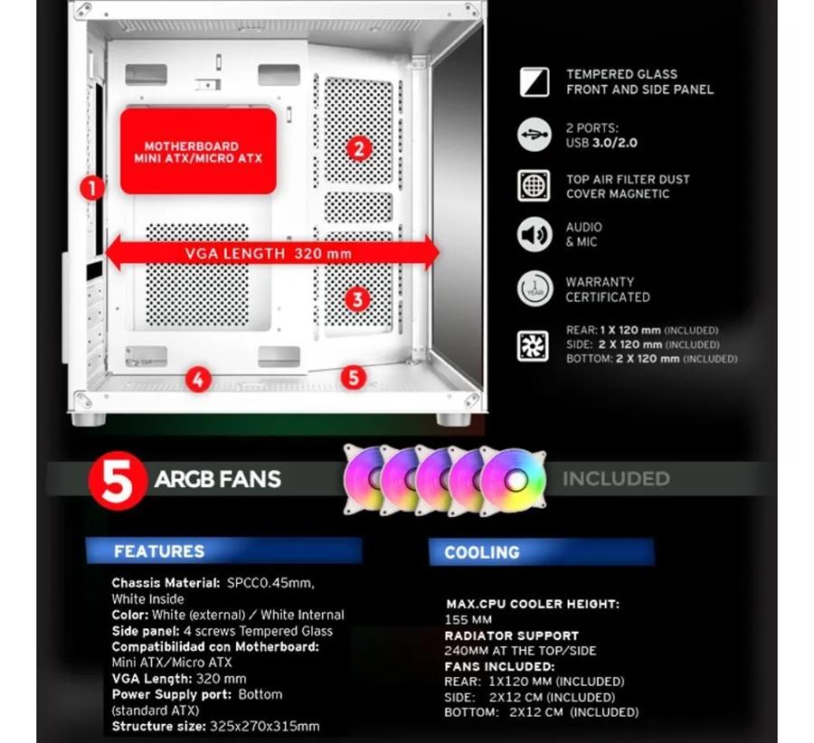 - Iluminacion : ARGB en 5 ventiladores incluidos
